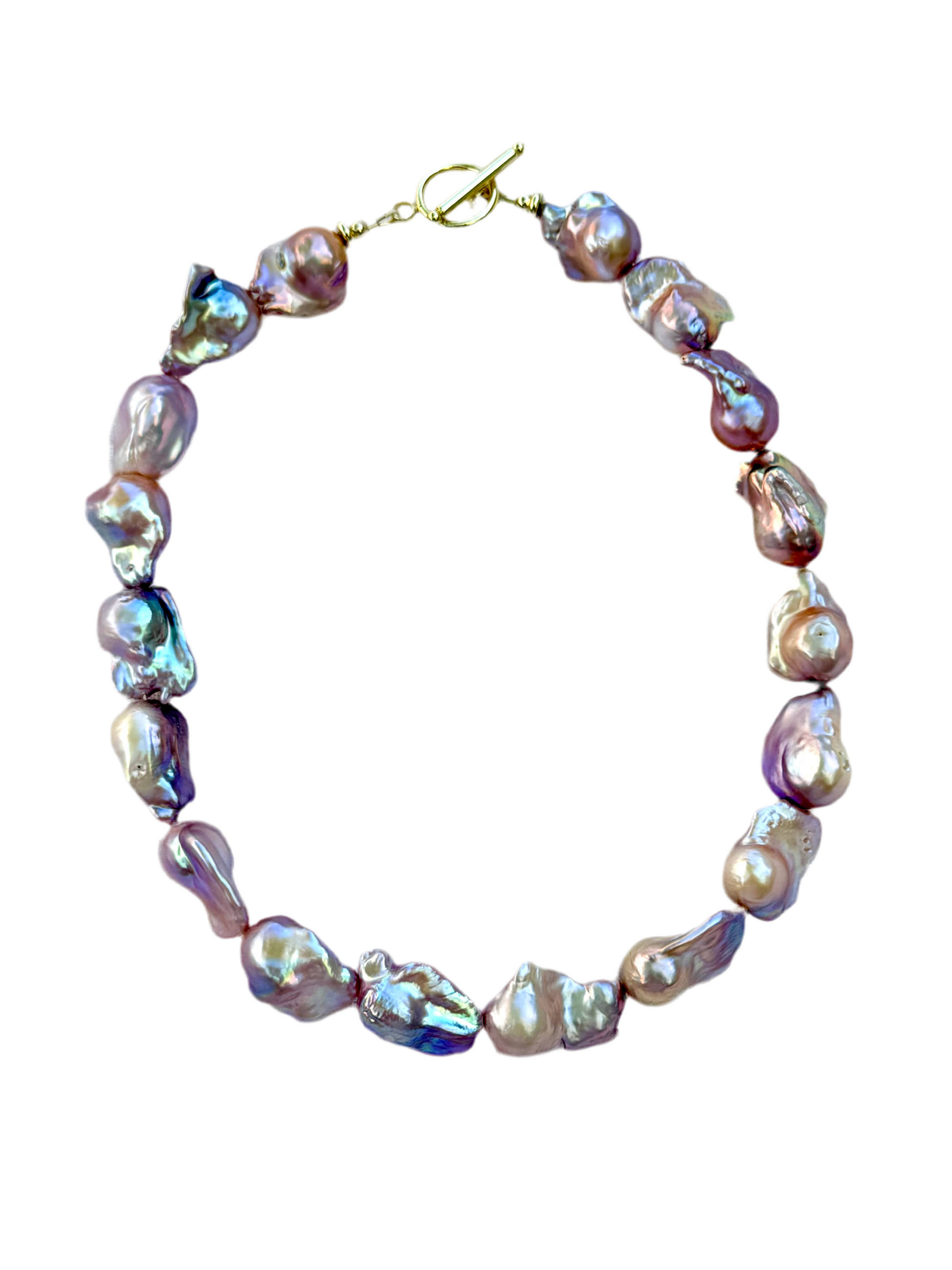Bold, luminous, and one-of-a-kind—this necklace features a stunning strand of pink baroque pearls, each uniquely shaped by nature’s artistry. The organic silhouettes and high luster of these pearls create a soft, sculptural statement that’s equal parts timeless and modern.