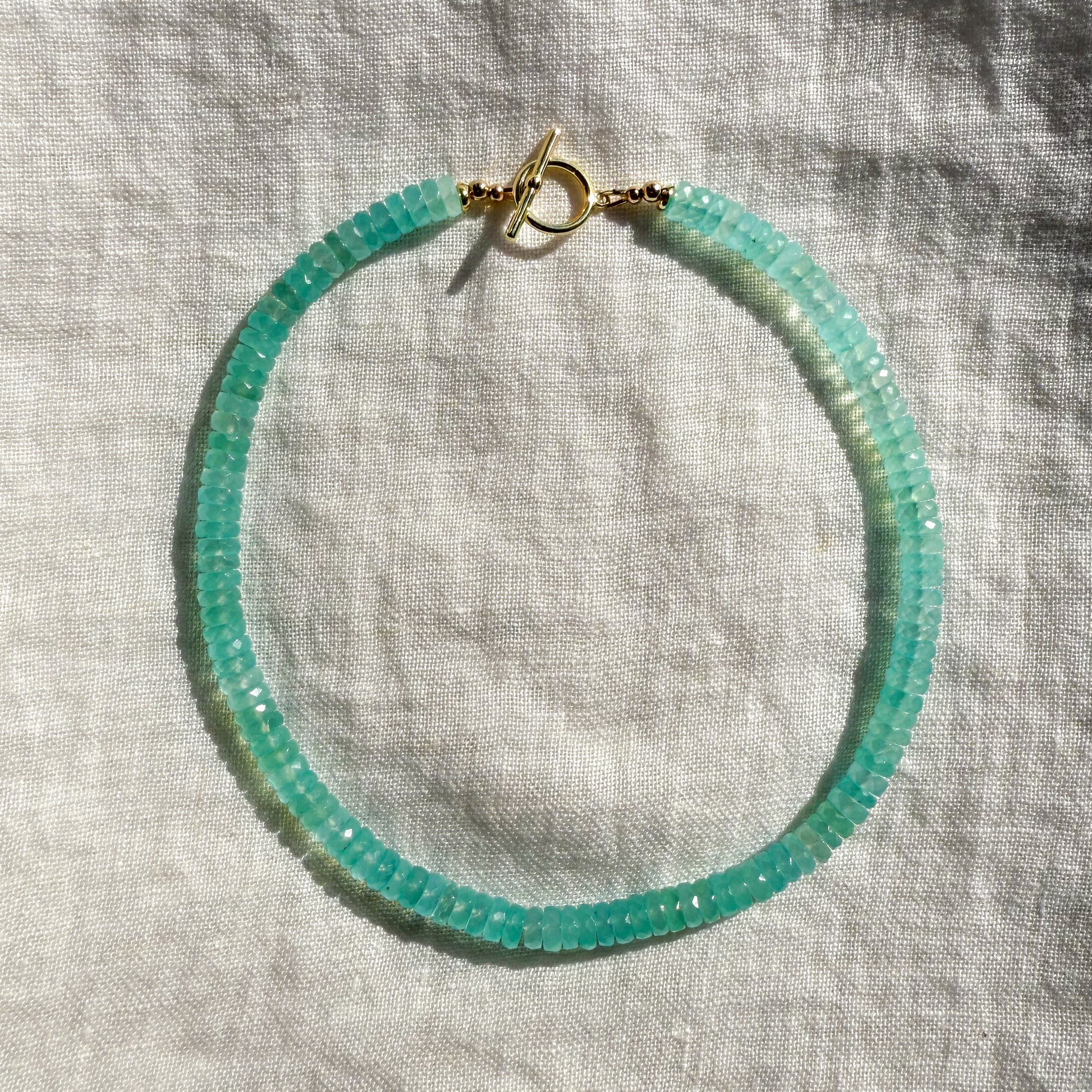The faceted stone collar necklace features a shimmering blue chalcedony that effortlessly dazzles.