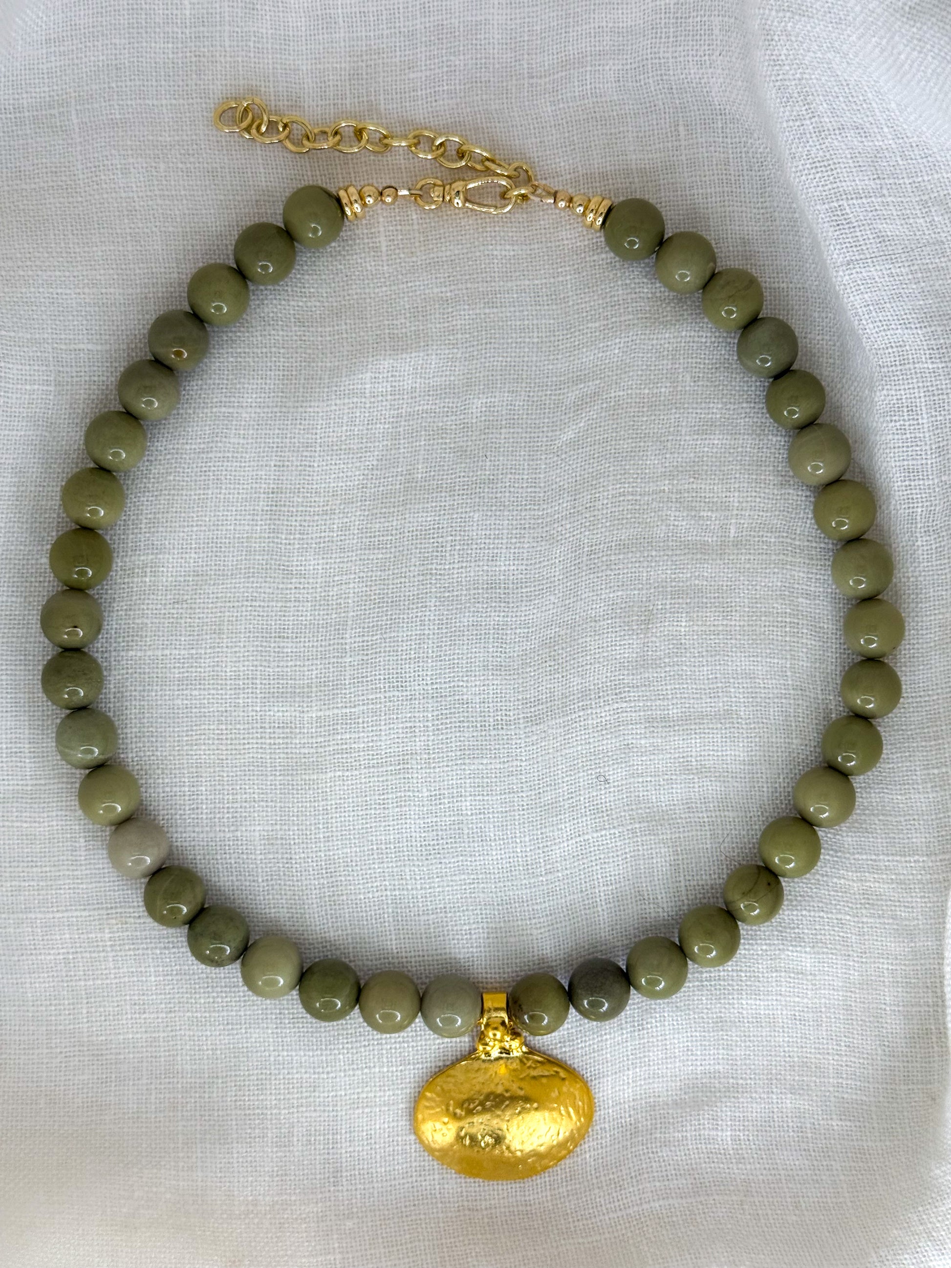 Experience the vibrant energy of the Vera Necklace! This beautiful piece features bright green African Jasper beads and a stunning gold dome pendant. Elevate any outfit with this unique and eye-catching necklace.