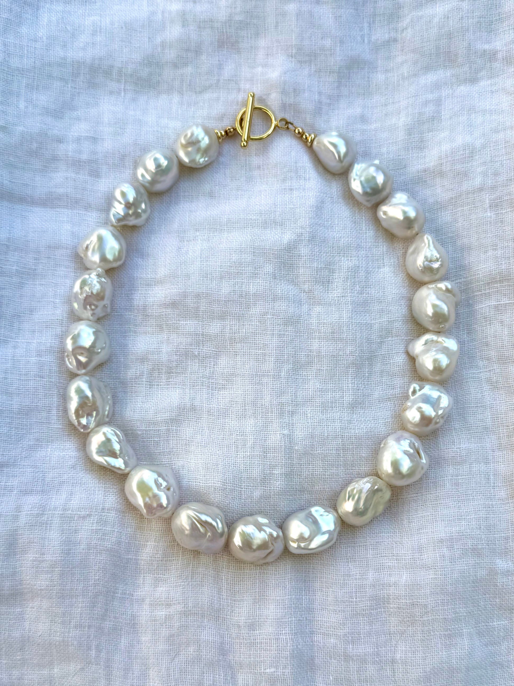 Bold, luminous, and one-of-a-kind—this necklace features a stunning strand of white baroque pearls, each uniquely shaped by nature’s artistry. The organic silhouettes and high luster of these pearls create a soft, sculptural statement that’s equal parts timeless and modern.